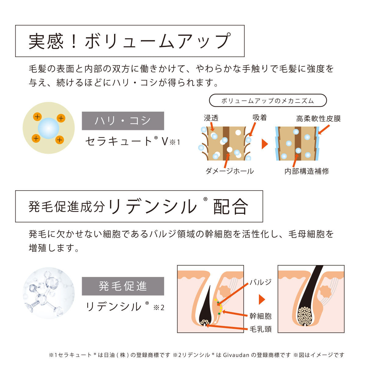 毛髪の表面と内部の双方に働きかけて、やわらかな手触りで毛髪に強度を与え、続けるほどにハリ・コシが得られます。