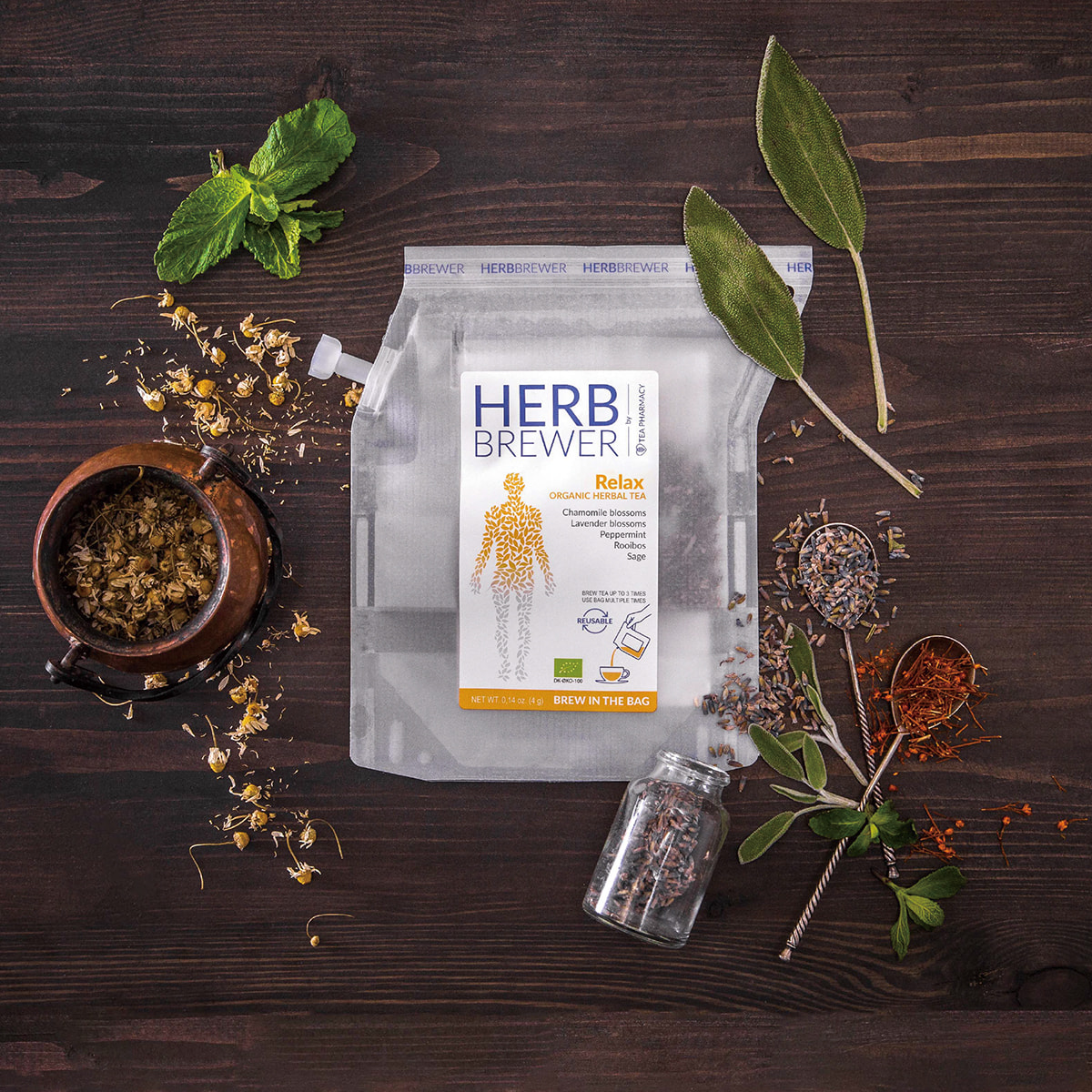 有機ルイボス、有機カモミール、有機ペパーミント、有機フェンネルスイート、有機レモングラス、有機レモンバーム、有機カルダモン、有機セージ、有機ラベンダー