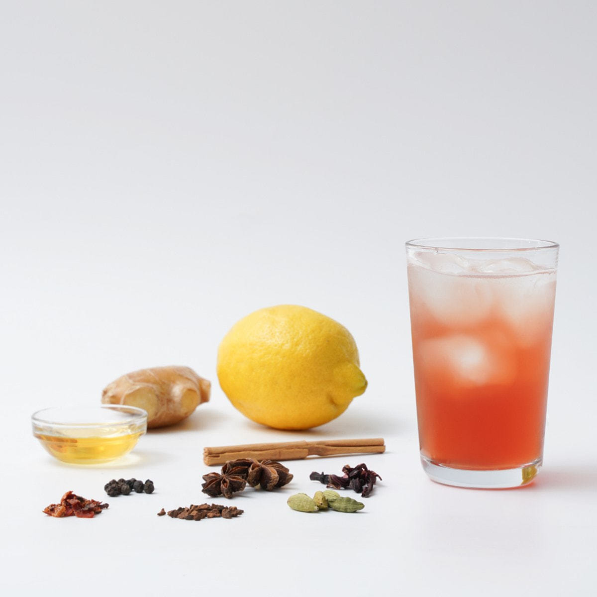 ・スパイスミックス:シナモン、ジンジャー、ローズヒップ、ブラックペッパー、コーラナッツ、ハイビスカス、スターアニス、カルダモン